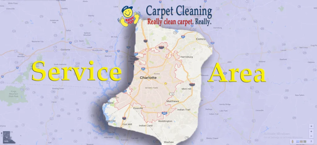 Happy Feet Carpet Cleaning services Charlotte, NC and surrounding areas such as Waxhaw, Monroe, Mint Hill, Pineville, Huntersville, Concord, and locations in South Carolina like Fort Mill, Rock Hill, Lancaster, and Indian Land.